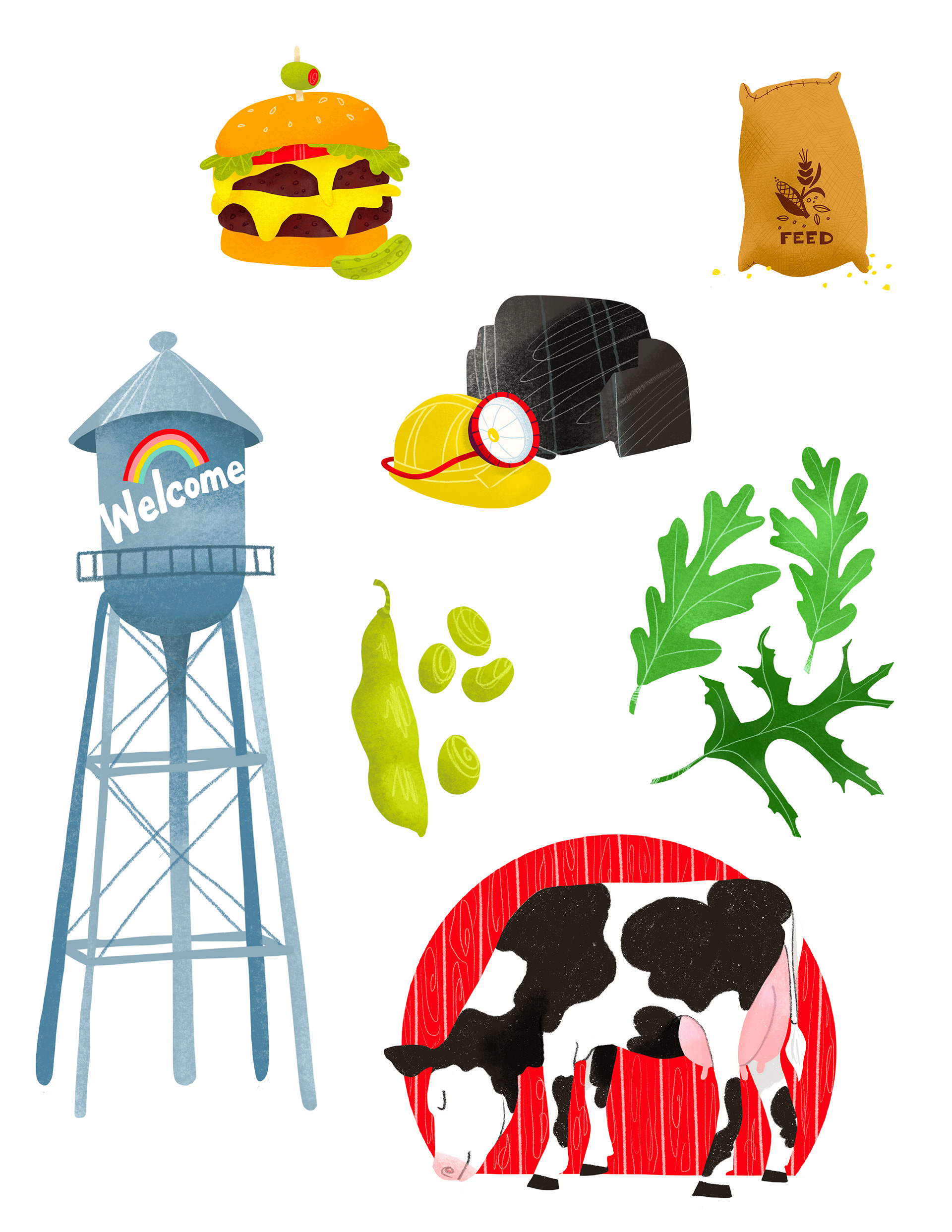 Veganism, responsible farming and trees could help stop global warming. Main and spot illustrations.