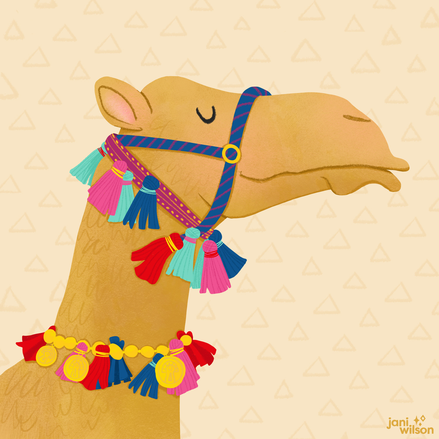 This proud Egyptian camel is decorated in colourful wool pompoms and gold coins.